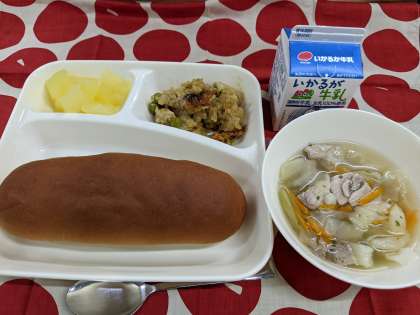 6月14日(火)のこんだては「カレードリア、豚肉とキャベツのスープ、りんご(缶)、黒糖パン、牛乳」です。