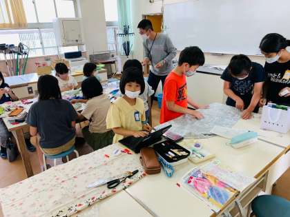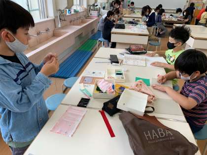 5・6年生が4年生に、玉止め・玉結びの仕方を分かりやすく教えています。