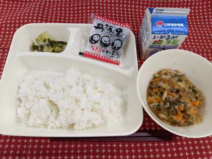 6月15日(水)のこんだては「マーボーはるさめ、チンゲンサイともやしの甘酢あえ、いり黒豆、ごはん、牛乳」です。