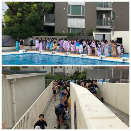 6月16日(木)、1時間目の5年生は気温が低くプール授業は断念しましたが、2時間目は気温も上がりプール授業「可」となりました。