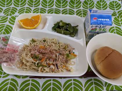 6月17日(金)のこんだては「和風焼きそば、きゅうりの甘酢和え、オレンジ、1/2黒糖パン、牛乳」です。