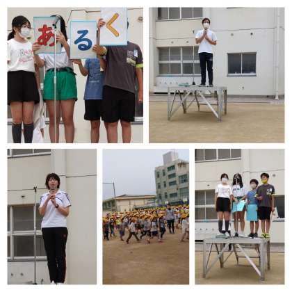 今日はとても蒸し暑いです。校長先生と皆さんは離れているのでマスクをはずします。皆さんもしゃべらないのではずしても大丈夫です。これからの季節は熱中症に注意が必要です。体育の時間、登下校の時、外で遊ぶとき、部屋の中でもしゃべらない時などはマスクをはずしましょう。でも、新型コロナウイルス感染症が収まったわけではありません。感染予防の手洗いは忘れずしっかりしてください。20秒間丁寧に手を洗いましょう。
