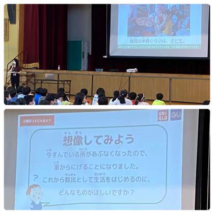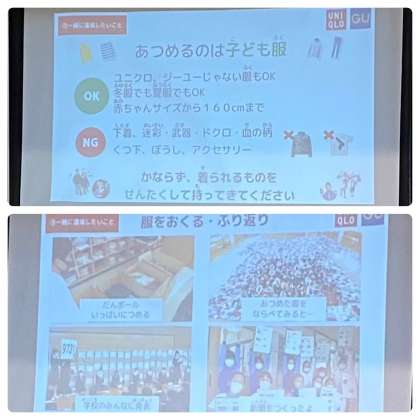 ユネスコスクールである本校では、今後、ユニクロに協力してもらって、子ども服を回収する予定です。