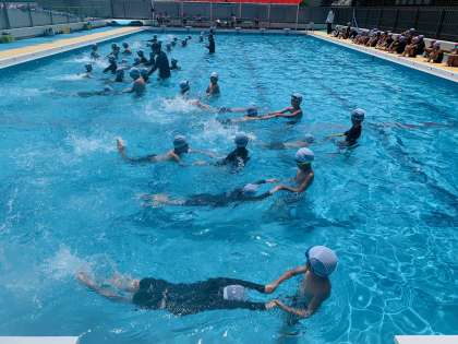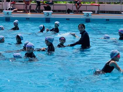 一緒に手をつないでもぐったり、水中じゃんけんをしたり、手を引いてもらいながら泳いだり、安全に気を付けて楽しく学習できました。