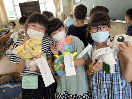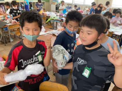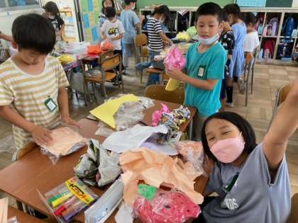 ビニール袋にカラフルな画用紙やチラシを入れて工作をしました。色々な材料から考えながら表現していました。できた作品には自分で名前を付けてました。ビニール袋のご用意ありがとうございました。作品は持って帰りますので、見てあげてください。
