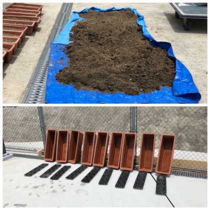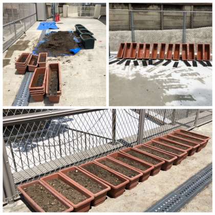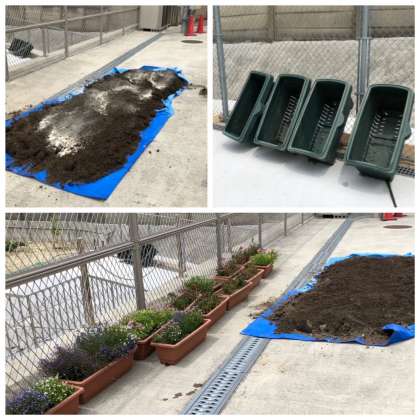 春の花(パンジー・ビオラ・ロベリア・ナデシコ・キンギョソウ)が、暑さとともに枯れ始めています。夏から秋に向けての花の苗を植えるために、プランターの土をいったん掘り出して土づくりをしています。