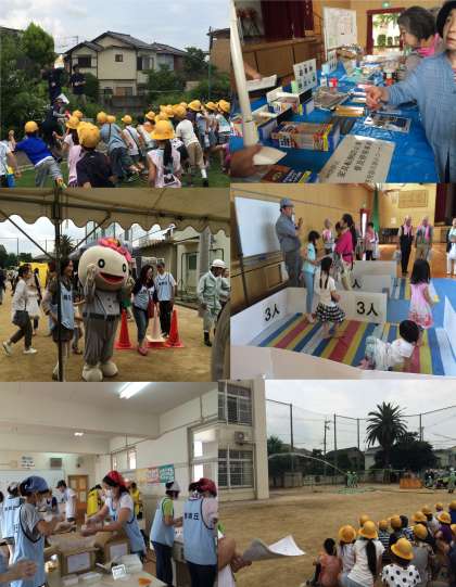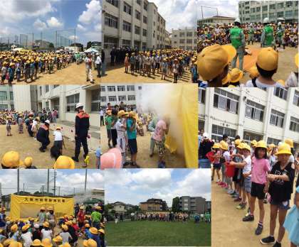 3時間目は、主に運動場で水消火器による消火訓練や水バケツリレー、