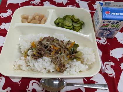 7月4日(月)のこんだては「牛丼、きゅうりのしょうがづけ、大福豆の煮もの、牛乳」です。
