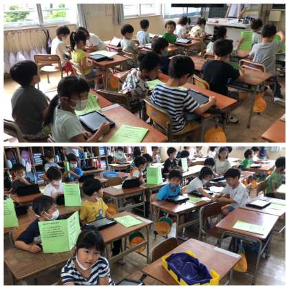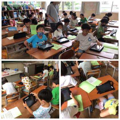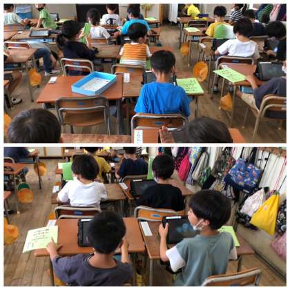 7月5日(火)2時間目、1年2組では一人一台端末(タブレット)の使い方を学習していました。ログインするのに時間がかかるので、動作中は静かに待ちます。それぞれに反応が違うので大変です。