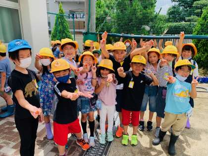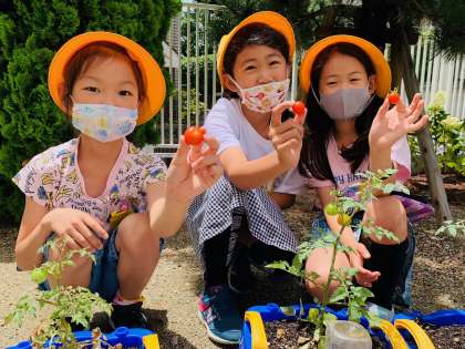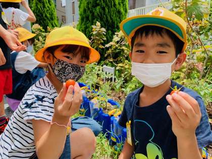 子ども達は、「赤いけど、もう少し収穫を待とうかな。」「いっぱいトマトができてるけど、色がまだまだ緑やなあ。」と、じっくりミニトマトの色を観察していました。
