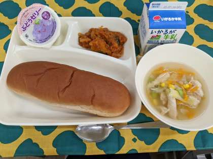 7月8日(金)のこんだては「かぼちゃのミートグラタン、スープ、ぶどうゼリー、黒糖パン、牛乳」です。