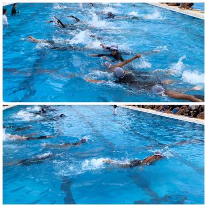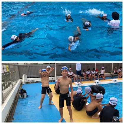 先生方もプール内で補助しながら、上手に泳げるように何回も練習です。