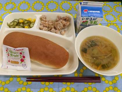 7月15日(金)のこんだては「鶏肉のから揚げ、中華みそスープ、きゅうりとコーンの甘酢あえ、コッペパン、りんごジャム、牛乳」です。