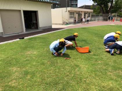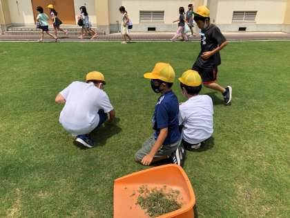 7月15日(金)昼休み、栽培委員が芝生の手入れをしています。