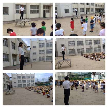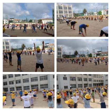 4月から続けてきた「ラジオ体操ワンポイントレッスン」のまとめとして、音楽に合わせてみんなでラジオ体操をしました。運動委員会のお友達が前に出て、校長先生と一緒にお手本を示してくれました。とてもすがすがしく、気持ちよく体操できました。