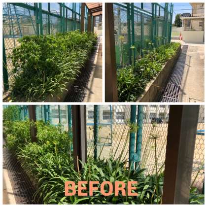 給食室南側のアガパンサスの花壇、自生するオシロイバナと枯れた花茎を撤去してスッキリしました。