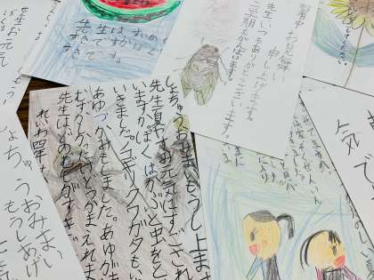 子ども達からの暑中見舞い・残暑見舞いのはがきが学校に届いています。