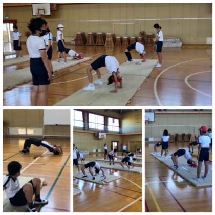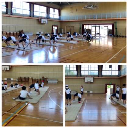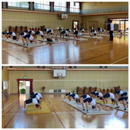 体育館で運動会に向けて、ブリッジの練習をしています。