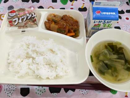 9月5日(月)のこんだては「酢豚、中華スープ、アーモンドフィッシュ、ごはん、牛乳」です。