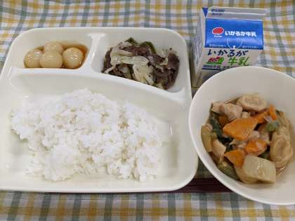9月6日(火)のこんだては「一口がんもとさといものみそ煮、牛肉と野菜のいためもの、みたらしだんご、ごはん、牛乳」です。
