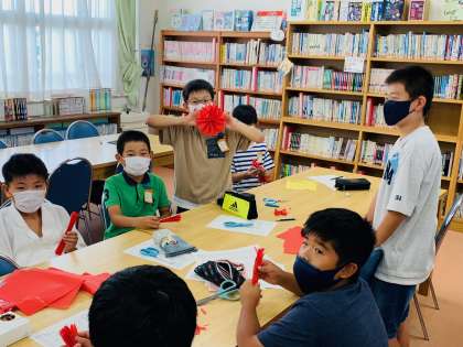 2学期の図書室開放当番を決めた後、運動会で使用する花飾りを作りました。