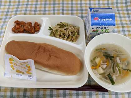 9月7日(水)のこんだては「ヤンニョムチキン、もやしととうふのスープ、切干しだいこんのナムル、コッペパン、マーマレード、牛乳」です。