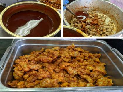今日のヤンニョムチキンは、揚げた鶏肉に、ケチャップ、料理酒、みりん、こい口しょうゆ、コチュジャンを合わせたタレをかけて、からめています。初登場のこんだてです。