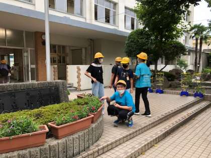 朝の登校時間を使って、正門にあるプランターの手入れをしています。
