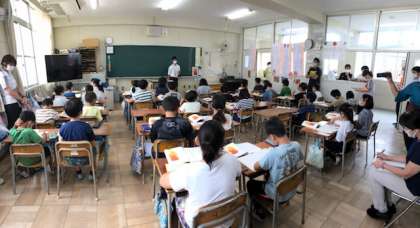 たくさんの先生方に囲まれた状況ですが、子どもたちは、いつもと変わることなく、集中して授業に取り組んでいます。