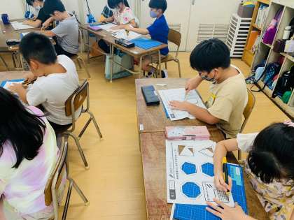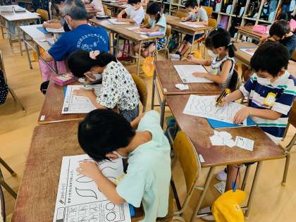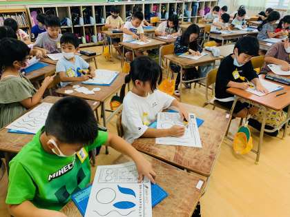 カッターナイフの持ち方、使い方を学習した後、色々な線を切ったり、形を切り抜いたりしました。