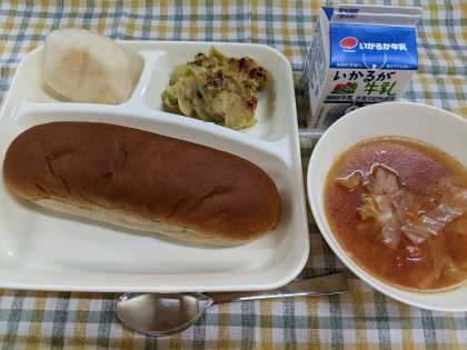 9月9日(金)のこんだては「豆乳マカロニグラタン〔米粉〕、トマトスープ、なし(二十世紀)、黒糖パン、牛乳」です。