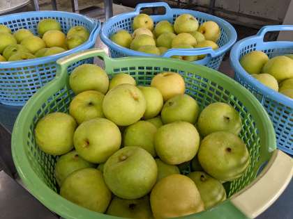 なしは、鳥取県産の二十世紀なしです。二十世紀なしの歴史は古く、1904年に「新しい世紀を代表する品種になるように」という意味を込めて「二十世紀」と名付けられたそうです。二十一世紀の現在でも人気のなしです。酸味と甘みのバランスが良く、シャキシャキとした食感が特徴です。