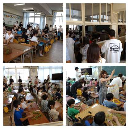 1年生は、種から育てた朝顔のつるを使って、お家の人と一緒にリースを作っていました。朝顔のつるがとても丈夫で長いのに、びっくりです。