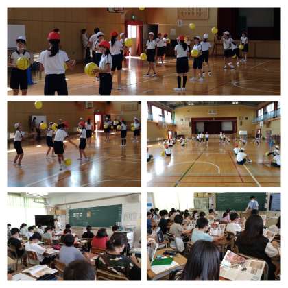 6年生は社会科と体育です。社会科は歴史の学習をしていました。講堂ではボールを使って、みんなで息を合わせて運動をしていました。