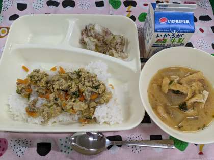 9月20日(火)のこんだては「他人丼、とうがんのみそ汁、キャベツの赤じそあえ、牛乳」です。