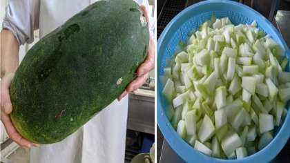 みそ汁にはとうがんが入っています。とうがんは夏が旬の野菜ですが、冬まで保存できることから「冬瓜」とよばれるようになったと言われています。水分が多くさっぱりとした味わいで、夏にぴったりの野菜です。