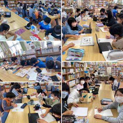 書きたいものをタブレットで調べたり本を持ってきたりして、それぞれが自由に作品を完成させています。