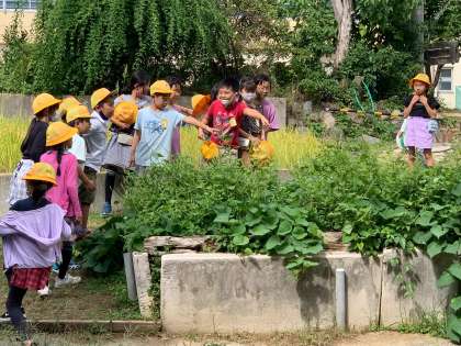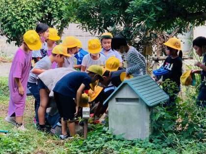 子どもたちは、三連休中に虫が快適に過ごせるよう、虫かごに手でたくさん集めた土を入れたり、暑さ対策の段ボールの囲いを用意したり、一生懸命にかごの中や周りの環境を整えていました。