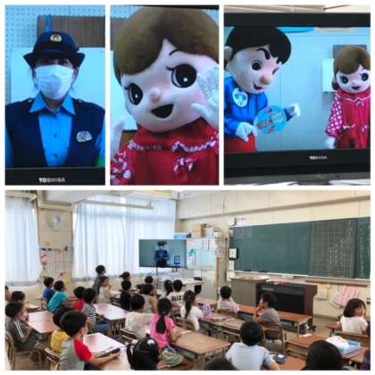 避難訓練(不審者対応)に引き続き、大阪府警察本部と阿倍野警察署の生活安全課より警察官に来ていただき、防犯教室をしていただきました。