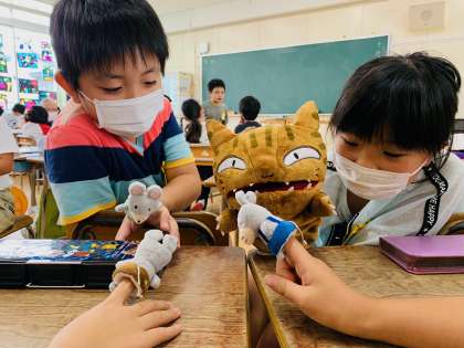 堂々とした先生役の児童が、ねこのこわさについて真剣に話しています。