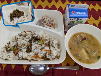 10月5日(水)のこんだては「もずくと豚ひき肉のジューシー、さつまいものみそ汁、焼きれんこん、ごはん、牛乳」です。