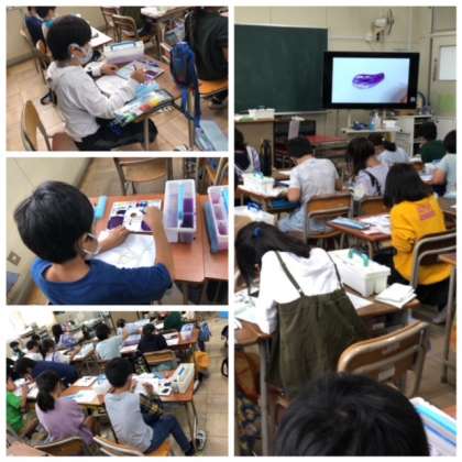 どんな色を使って表現するのか、絵の具を溶かしながら「なす」の色を作っています。