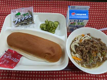 10月7日(金)のこんだては「タンタンめん、きゅうりのあまずづけ、ミニフィッシュ、コッペパン、いちごジャム、牛乳」です。