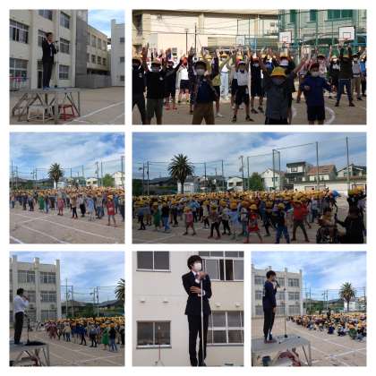 10月11日児童朝会の様子です。今日は火曜日ですが、今日からくる教育実習生の紹介を兼ねて児童朝会を行いました。