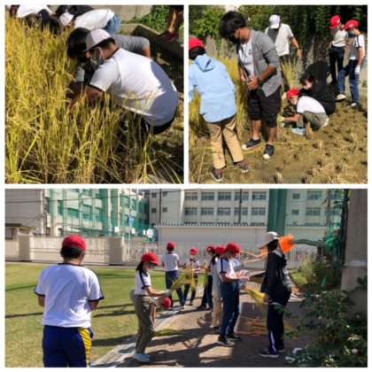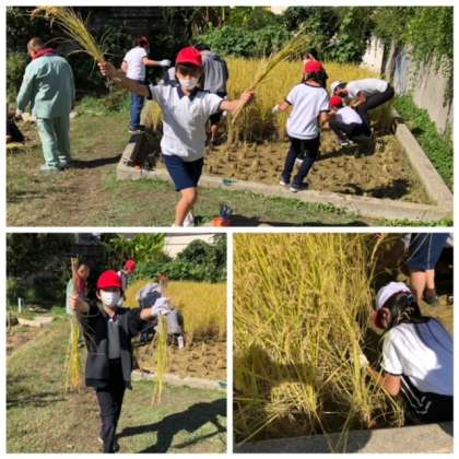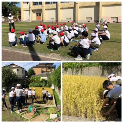 担任の先生から、稲の刈り方、特にカマを使う場合の注意点をしっかり聞きます。
