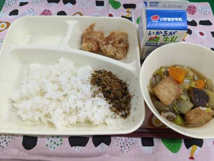 10月11日(火)のこんだては「鶏肉のたつたあげ、あつあげと野菜の煮もの、おかかなっ葉、ごはん、牛乳」です。