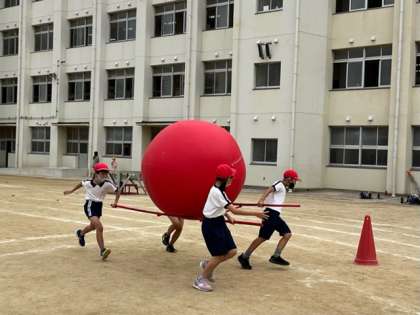 大玉を4人で協力して運びます。