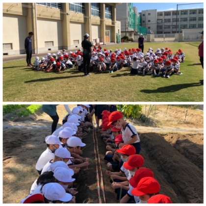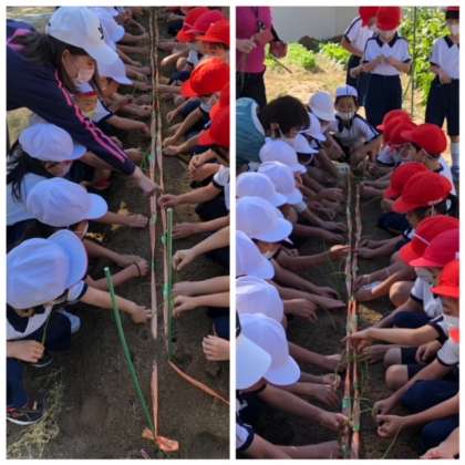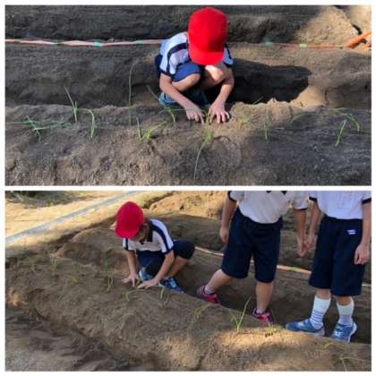 クスノキ広場の畑に、「たまねぎ」を植えるので、せっかくのなので1年生に体験してもらいました。