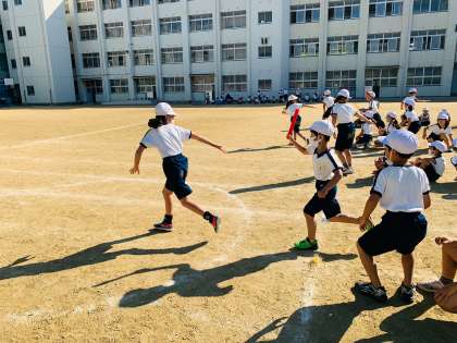 普段のリレーは手でタッチし合って走者が交代していましたが、運動会で見た高学年のリレーに触発され、「バトンを使ったリレーがしたい!」と、やる気いっぱいの子ども達。