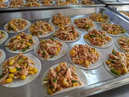 変わりピザは、ぎょうざの皮を使った一口サイズのピザです。ツナ、コーン、ピーマン、ピザソース、チーズを混ぜ合わせた具を、ぎょうざの皮の上にひとつひとつのせて、焼いています。「もっと食べたい」と、いつも人気のこんだてです。